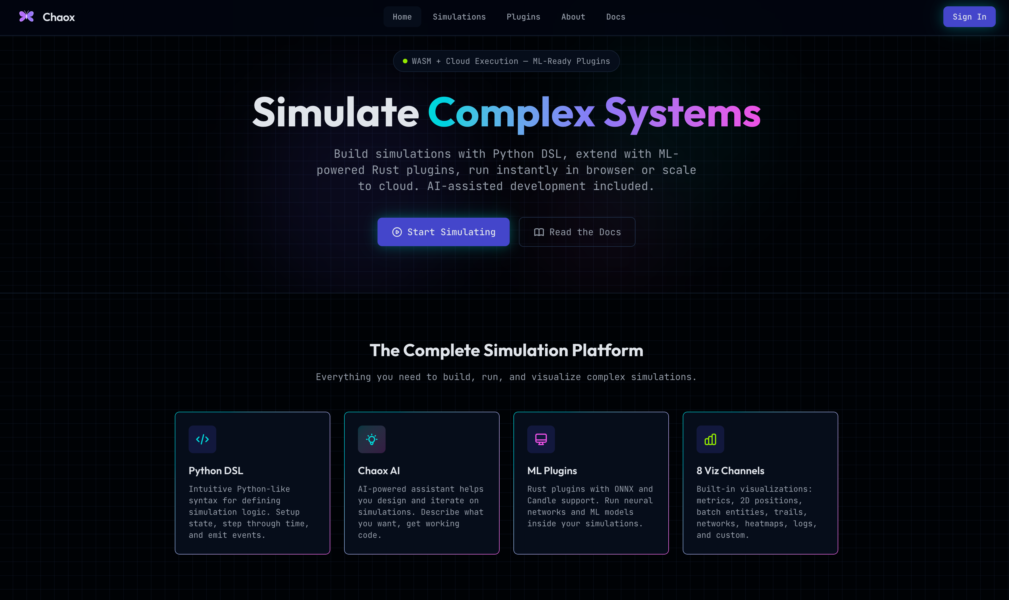 The project is called Chaox. It allows you to create simulations using a custom Python-like DSL (domain-specific language). The DSL is then compiled into an IR (intermediate representation) which is executed inside a custom Rust engine. The simulation may be run directly in the browser using WebAssembly, or on the Chaox cloud. There is a built-in AI assistant which can help you draft simulations (and validates that they compile), as well as usage tracking to monitor cloud and AI spend. Additionally, there is support for custom Rust plugins which can be used within simulations, enabling capabilities like ML inference within simulation time steps using either ONNX or Candle.